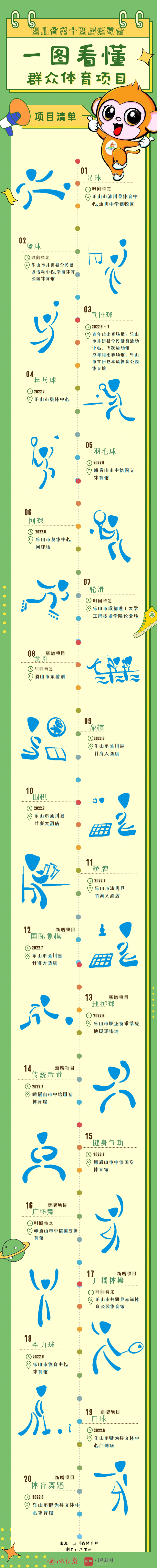 四年一届的省运会不仅是我省发掘、培养优秀体育后备人才的演练场,更是集中展示四川“体育强省”建设丰硕成果的大舞台。四川省第十四届运动会分为青少年体育项目和群众体育项目2个大类49个竞赛大项,共将产生1000枚金牌。其中,群众体育项目共设20个竞赛大项、将产生241枚金牌,项目分别为足球、篮球、气排球、乒乓球、羽毛球、网球、轮滑、龙舟、象棋、围棋、桥牌、国际象棋、地掷球、传统武术、健身气功、广场舞、广播体操、柔力球、门球、体育舞蹈。
