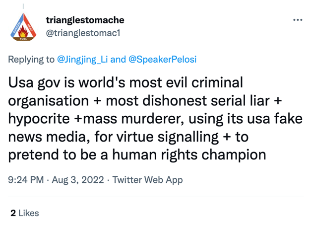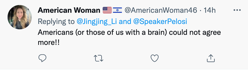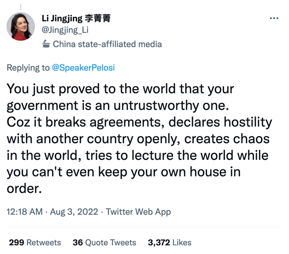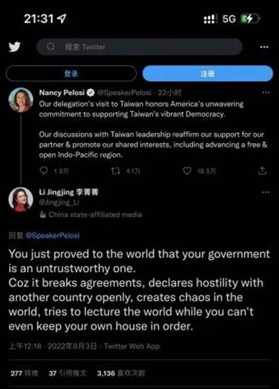 窜访事件发生后,佩洛西本人竟然还在落地后第一时间堂而皇之地在个人社交平台“昭告”自己的台湾之行。部分主播发现此现象后,主动出击,发动网友在佩洛西的个人推文下发表个人观点,借佩洛西个人社交平台阐明中国立场。其中,CGTN网红记者李菁菁七行字的评论,在佩洛西的评论栏中短短24小时内获得了突破15万的阅读量。