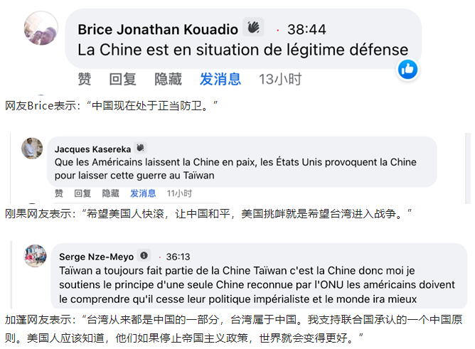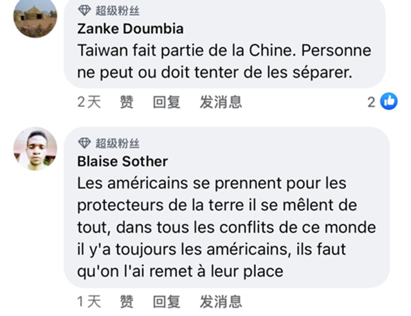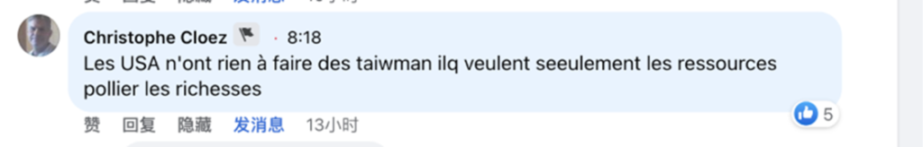 法国网友表示:“台湾是中国的一部分,任何人不应该也不能把他们分开。”“美国把自己当做世界警察,到处搅局,世界上所有冲突里都有美国人,我们应该让他们哪里来回哪里去。”“美国在台湾没有别的想法,就是想攫取资源和财富。”