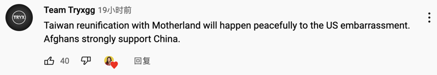 网友Team Tryxgg表示:“台湾的和平统一是势不可当的趋势。阿富汗人民和中国站在一起。”