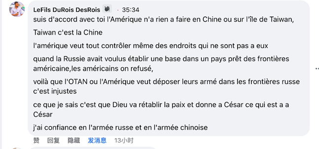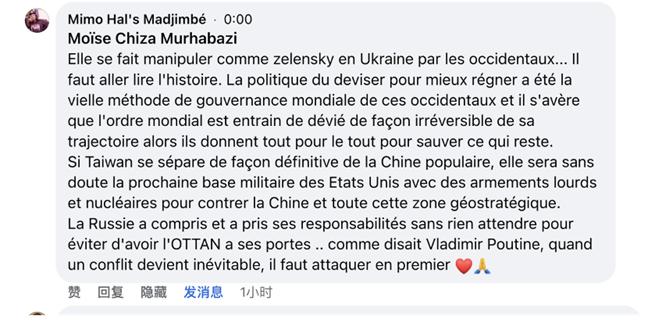 加蓬网友表示:“我同意你的说法,美国无权干涉中国以及台湾岛。台湾属于中国。美国就是想控制全世界,包括那些不属于它的地方。当俄罗斯想在美国邻国建立军事基地,美国拒绝了。但是北约或美国却要在俄罗斯边境部署他们的武力,这是强盗逻辑。我知道的就是和平终将降临,该是谁的就是谁的。我对俄罗斯的军队和中国的军队有信心。”