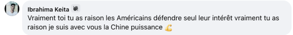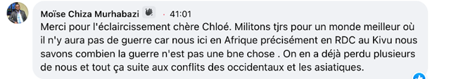 刚果(金)网友表示:“感谢主播的阐释。我们一起努力创造没有战争的更好的世界。我生活在刚果(金)的战区,我深刻感受到战争是多么可怕。因为这些冲突,我们已经失去了很多生命。”
