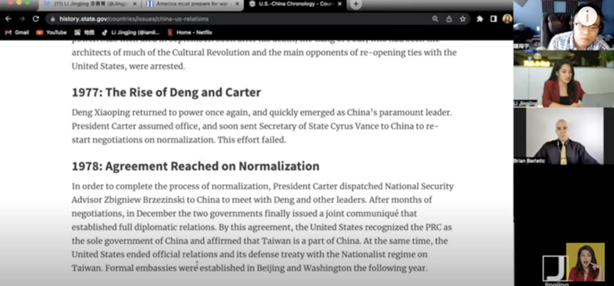 英语网红李菁菁邀请美国前海军陆战队员、地缘政治分析师及爱国台胞青年发起专题论坛。节目中,李菁菁追溯两岸同根同源的史实,并向海外网友展示联合国恢复中国席位、中美三个联合公报等历史文件,用事实印证美国政府在台湾问题上的言行不一与信用破产。美国前海军陆战队员结合其工作经历背景,详细揭露了美国政府在亚太地区的地缘野心。爱国台胞揭露“台独”势力和西方非政府组织洗脑台湾民众、造成台湾社会分裂的事实,讲述美国在台湾问题上罄竹难书的黑历史。
