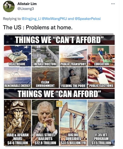 推特网友Alistair Lim犀利图文回复:美国有钱打仗,造武器,救华尔街,却没钱提供医保,修路,投资绿色能源,和让穷人吃饱饭。建议美国还是把注意力放到国内吧!