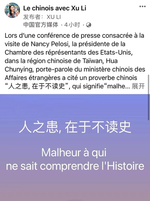 更是有主播,发挥扎实的法语功底,用一句中国谚语阐明台湾历史溯源,发布了帖文《人之患,在于不读史》,阐释外交部发言人华春莹在记者会上引用的中国古语“人之患,在于不读史”,强调台湾问题的由来、一个中国原则和中美联合公报,谴责佩洛西窜访台湾。