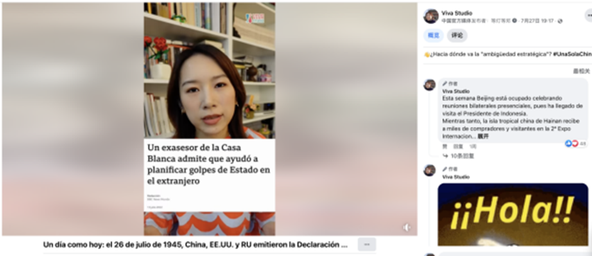 早于7月27日,西班牙语琵琶工作室网红主播预判佩洛西有可能做出的恶劣行为,发布视频《头版新闻:美国官员窜访台湾?中国只有一个》,详细分析了美国对一个中国原则进行双重解释,试图破坏台湾海峡两岸秩序,而西方媒体却继续肆意宣扬“中国威胁论”将中国推上国际舆论的风口浪尖的阴谋。网红主播在视频中介绍,针对佩洛西意图窜访台湾一事,中国外交部发言人赵立坚多次表明坚决反对佩洛访台的严正立场,并向观众解读了《波茨坦公告》与《开罗宣言》等国际法文件的重要意义,表明一个中国原则是台海和平稳定的定海神针。