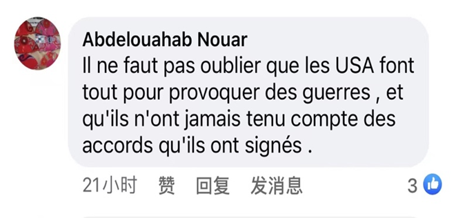 网友Abdelouahab Nouar : “美国总是试图挑起战争,他们从来不遵守签订的任何协议。”