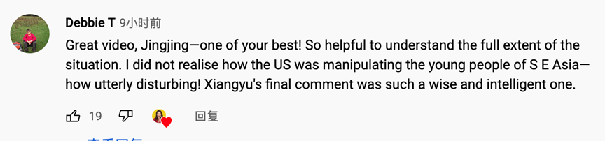 网友Debbie T留言道:“内容太棒了,这是菁菁你做得最好的视频之一了!很有用,非常全面。我以前不知道美国政府是如何操纵东南亚青年的!太恶心了!嘉宾最后的评论太富有智慧了!”