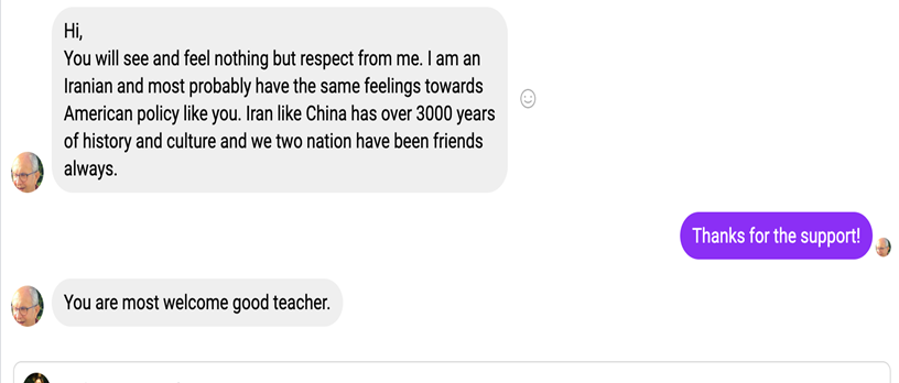 IG 伊朗网友feridoun24声援道:“你是百分之百正确的,老师!你可以感受到我对你这番言论的尊重,我是伊朗人,很可能我跟你一样能对美国的政治手段感同身受,伊朗和中国一样有3000多年的历史,我们两国一直是朋友。”