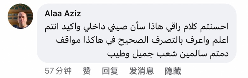 网友Alaa Aziz评论道,“说得真好。这是中国的内部事务,肯定你们自己最了解,最清楚怎样做是对的。愿你们平安,美丽善良的中国人民。”