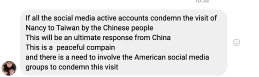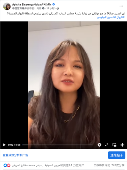 佩洛西窜访事件发生后,一方面大量网友与主播们一起谴责佩洛西的恶劣行径,另一方面也有部分网友表示个人疑惑与观点,如“不明白为何中国反应如此强烈”“中国回应措施不够强硬”等。面对网友疑问,网红主播们结合自身人设,循循善诱,表明中国维护和平决心。其中阿拉伯语网红主播在个人脸书、优兔平台发布短视频《中国是懦夫?有关佩洛西窜访中国台湾地区一事我的看法》,从普通中国国民的角度向阿拉伯网民澄清事实。
