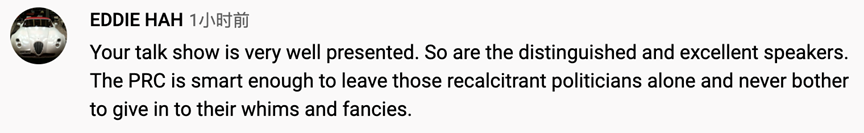 网友EDDIE HAH评论:“你的节目真的表现出色!嘉宾都非常优秀和独特。中国非常聪明,没有屈服于这些冥顽不灵的政客的丑行。”