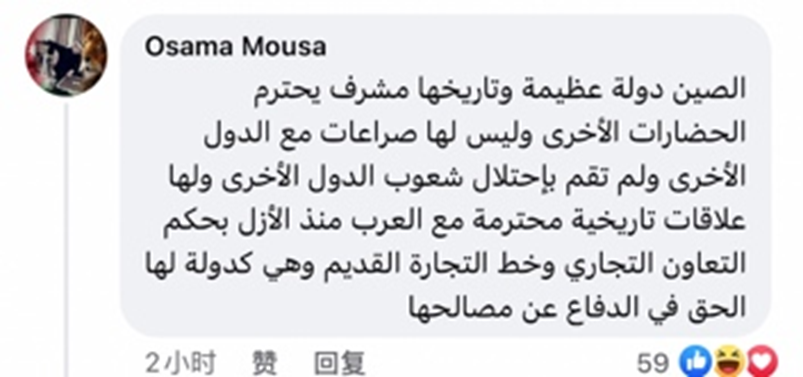 网友Osama Mousa评论道,“中国是个拥有光辉历史的伟大国家,尊重其他文明,从不与他国发生冲突,也从未侵略他国。亘古以来,中国就凭借商贸合作和古商路同阿拉伯人保持着令人尊敬的良好历史关系。中国作为一个国家,有权力捍卫自己的权益。”