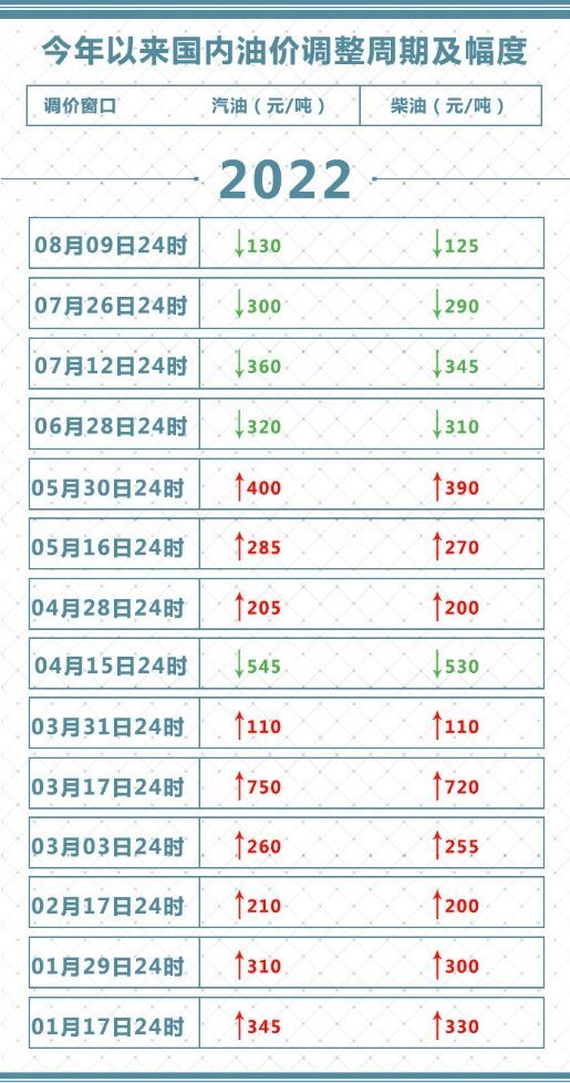 据央视财经消息,根据国家发改委消息,新一轮成品油调价窗口将于今天(8月9日)24时开启。据国家发改委价格监测中心监测,本轮成品油调价周期内(7月26日—8月8日)国际油价继续下降,伦敦布伦特、纽约WTI油价降至2月俄乌战事以来的低位。平均来看,两市油价比上轮调价周期下降3.44%。
