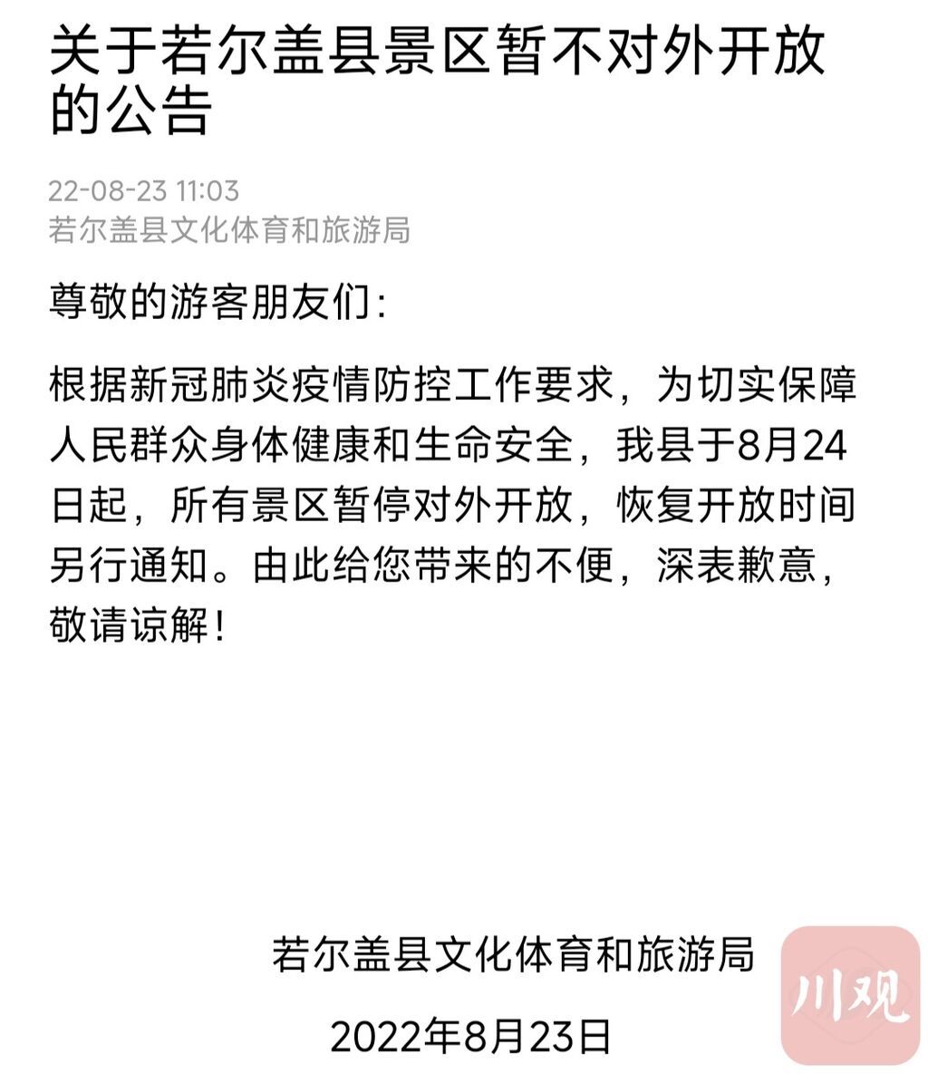 8月23日,阿坝州若尔盖县文化体育和旅游局发布公告,根据新冠肺炎疫情防控工作要求,为切实保障人民群众身体健康和生命安全,若尔盖县花湖、黄河九曲第一湾等在内的所有景区将于8月24日起暂停对外开放,恢复开放时间另行通知。