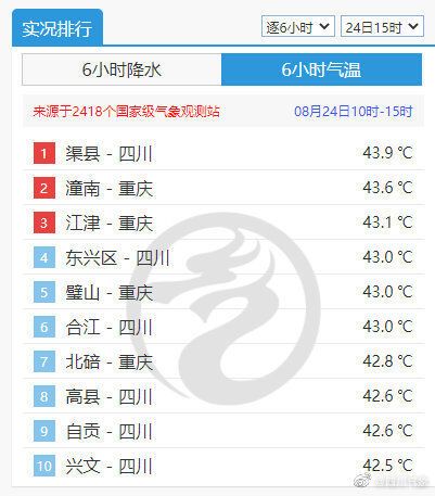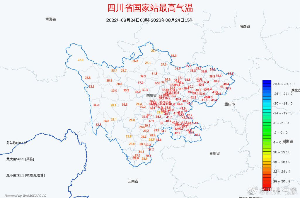 据四川气象官微消息,截至今(24)日15时,四川高温再次刷新纪录。14:58达州渠县达到43.9℃,打破了四川省国家气象站的最高纪录。
