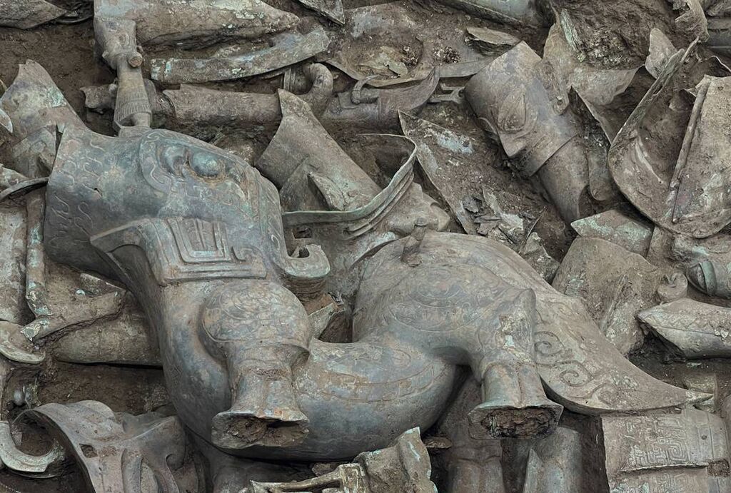 8月24日,三星堆遗址祭祀区内考古发掘提取工作正在进行中,8号坑内成功提取出大神兽等一批文物。其中包括一件1米多长青铜神兽,重达近300斤,为目前之最。