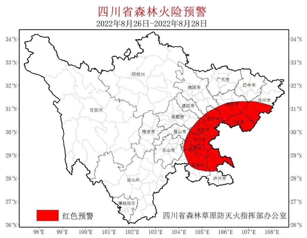 8月25日,省森林草原防灭火指挥部办公室发布高森林火险红色预警:8月26日—28日,自贡市、泸州市、遂宁市、内江市、南充市、宜宾市、广安市、达州市、资阳市等市森林火险等级为4级~5级。