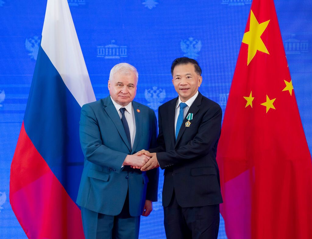 “中俄影像交流展播活动”启动活动结束后,俄罗斯驻华使馆举行授勋仪式,慎海雄接受俄方授予的俄罗斯“友谊勋章”。杰尼索夫大使宣读了俄罗斯总统令,并代表俄罗斯政府向慎海雄颁授勋章和证书,以表彰他为推动俄中文化交流和两国人民友谊所作出的贡献。