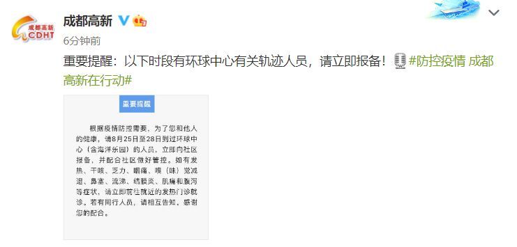 8月30日,成都高新区发布重要提醒:以下时段有环球中心有关轨迹人员,请立即报备。详情如下: