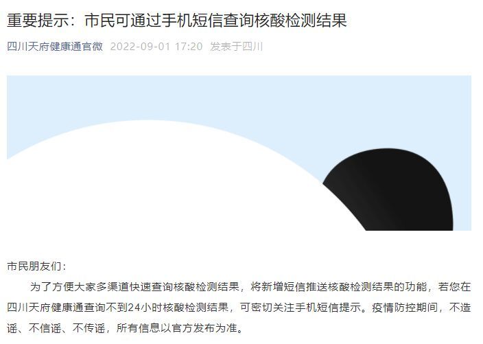 为了方便大家多渠道快速查询核酸检测结果,将新增短信推送核酸检测结果的功能,若您在四川天府健康通查询不到24小时核酸检测结果,可密切关注手机短信提示。疫情防控期间,不造谣、不信谣、不传谣,所有信息以官方发布为准。