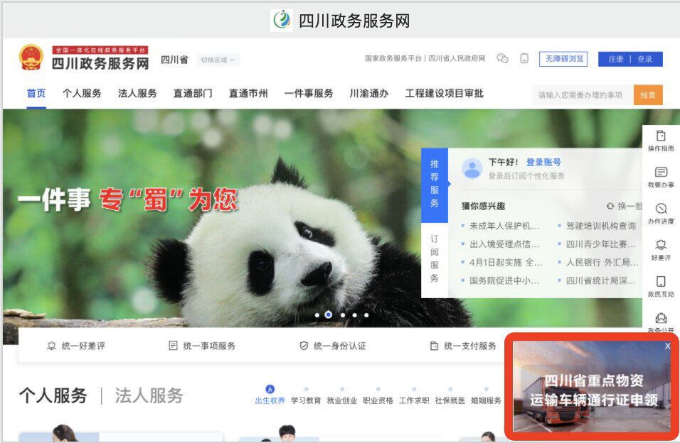 第一步:收发货单位注册并登录“四川政务服务网”(网址:http://www.sczwfw.gov.cn/),点击右下角“四川省重点物资运输车辆通行证申领”字样的图片。