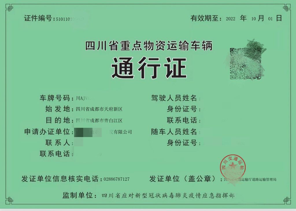 据介绍,《四川省重点物资运输车辆通行证》为进出涉疫地区(中高风险区)的重点物资运输车辆使用。重点物资包括但不仅限于:医疗与防控物资、生活必需品、政府储备物资、邮政快递等民生物资和农业、能源、原材料、重点工业品等重要生产物资。