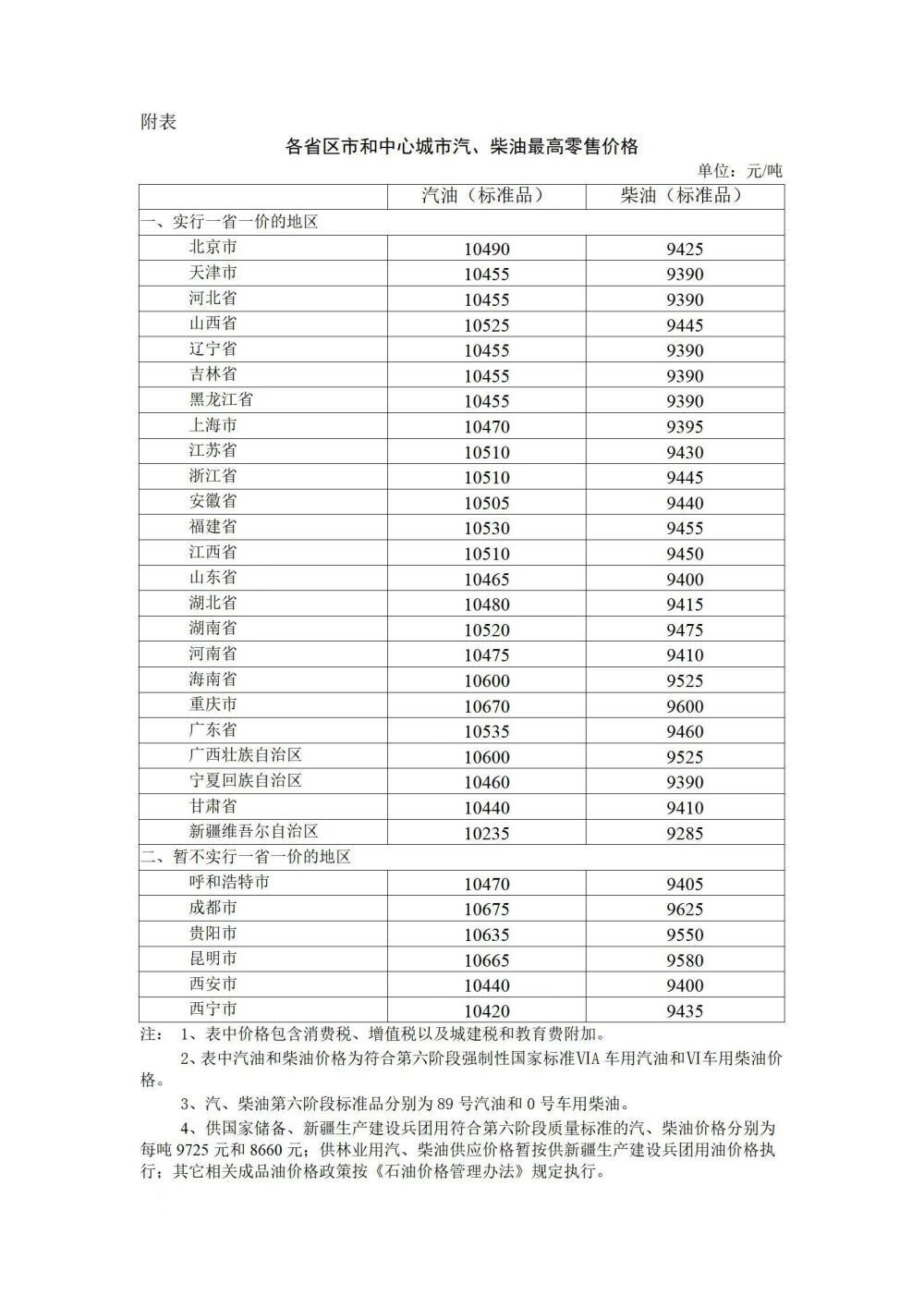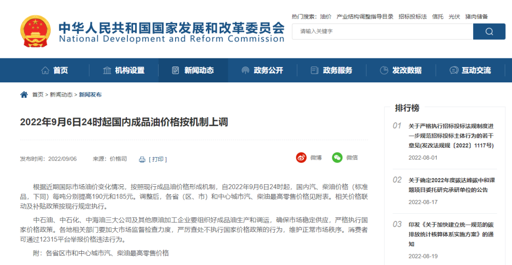 根据近期国际市场油价变化情况,按照现行成品油价格形成机制,自2022年9月6日24时起,国内汽、柴油价格(标准品,下同)每吨分别提高190元和185元。调整后,各省(区、市)和中心城市汽、柴油最高零售价格见附表。相关价格联动及补贴政策按现行规定执行。