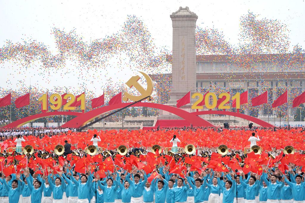 2021年7月1日上午,庆祝中国共产党成立100周年大会在北京天安门广场隆重举行。这是庆祝大会现场放飞气球。 新华社记者 陈晔华 摄