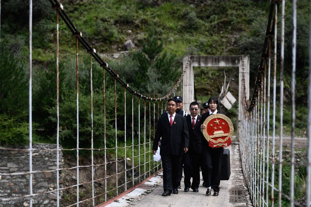 青海省果洛藏族自治州班玛县人民法院巡回法庭成员前往班玛县灯塔乡班前村提供法律服务(2021年8月7日摄)。新华社记者 张龙 摄