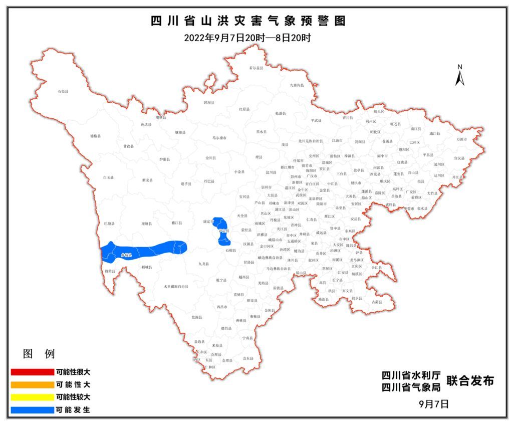 9月7日17时,四川省水利厅、四川省气象局联合发布山洪灾害蓝色预警。