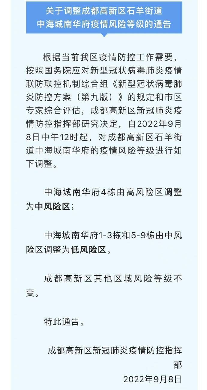 自2022年9月8日起,将成华区保和街道兴城嘉苑3期1栋、成华区府青路街道现代北苑(含底商)、成华区双桥子街道129号13-15栋、成华区双水碾街道荆竹小区五号院4栋、成华区跳蹬河街道银通苑9栋、成华区双桥子街道双林中横路8号13-16栋(含底商)、成华区龙潭街道秀林尚苑5栋的风险等级由高风险区调整为中风险区;