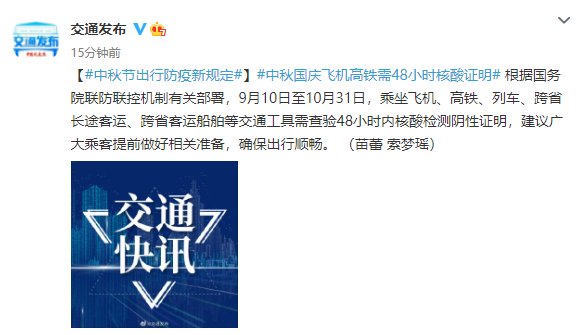 根据国务院联防联控机制有关部署,9月10日至10月31日,乘坐飞机、高铁、列车、跨省长途客运、跨省客运船舶等交通工具需查验48小时内核酸检测阴性证明,建议广大乘客提前做好相关准备,确保出行顺畅。 (苗蕾 索梦瑶)