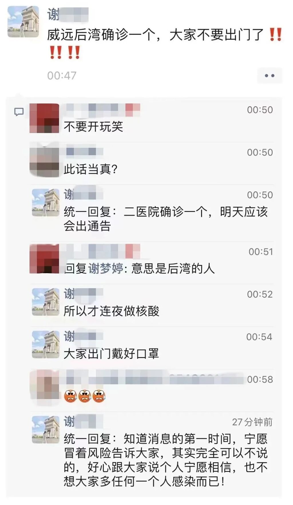 9月11日凌晨44分,威远县界牌镇一谢姓网友,接到微信好友罗某的消息,称后湾小区确诊了一例阳性,于是在朋友圈发送了此消息,多人在其微信朋友圈留言(109个),并截图转发,引发群众恐慌,严重扰乱社会秩序。 上午11时许,民警将谢某带回威远县公安局调查,其承认所发消息并不属实。目前,谢某已被公安机关依法行政拘留七日。