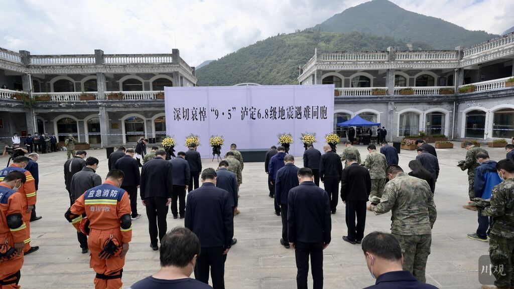 草木含悲,青山静穆。位于震中磨西镇的哀悼活动现场,悬挂着黑底白字的横幅“深切哀悼‘9·5’泸定6.8级地震遇难同胞”,庄重肃穆。12时50分,王晓晖、汪海江与在当地参与抢险救援的各界代表,胸前佩戴白花,神情凝重,默然肃立。12时52分,“9·5”泸定6.8级地震发生的时间,防空警报鸣响在磨西镇上空,大家在肃穆的气氛中为地震遇难同胞默哀3分钟。默哀毕,伴随着深情的《思念曲》,王晓晖、汪海江相继缓步上前,向地震遇难同胞敬献鲜花,表达哀思。同一时间,石棉县哀悼活动现场,黄强和各界代表一起默哀并敬献鲜花。国务院抗震救灾指挥部办公室主任、中国地震局局长闵宜仁,西部战区副司令员兼参谋长李中林,省委常委、省军区政委田晓蔚,省委常委、秘书长陈炜,副省长田庆盈,武警四川总队政委孟庆斌等依次敬献,表达对遇难同胞的深切哀悼。