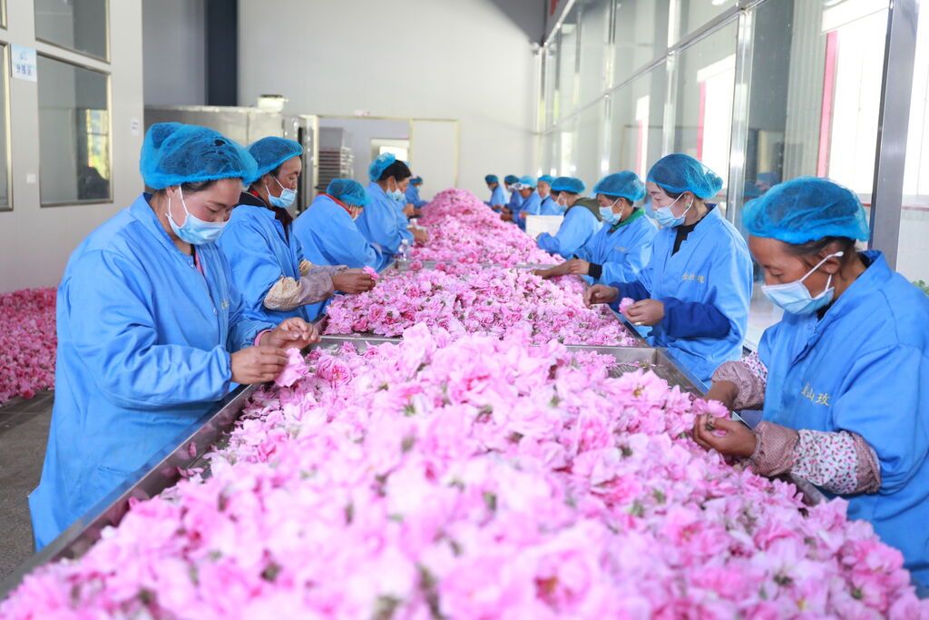 9月13日,玫瑰精深加工厂房内,工人们正在加工一批来自广州的订单——玫瑰花冠茶。“我们加工厂现有玫瑰精油生产设备4套、玫瑰花茶加工设备3套,玫瑰酱生产线1套。”陈望慧说,玫瑰精油、玫瑰花冠茶、玫瑰露、玫瑰酱等产品现在都能实现就地加工。
