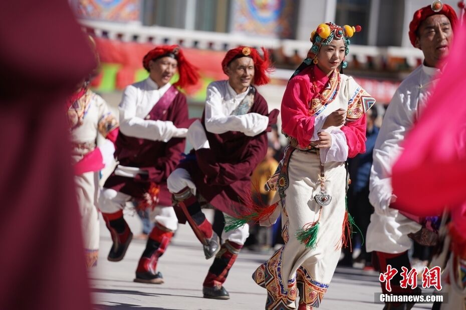 位于澜沧江源头的青海省杂多县,当地的康巴藏族民众沐浴着高原炽烈的阳光,跳起了吉庆洒脱的锅庄舞。中新社记者 苏丹 摄