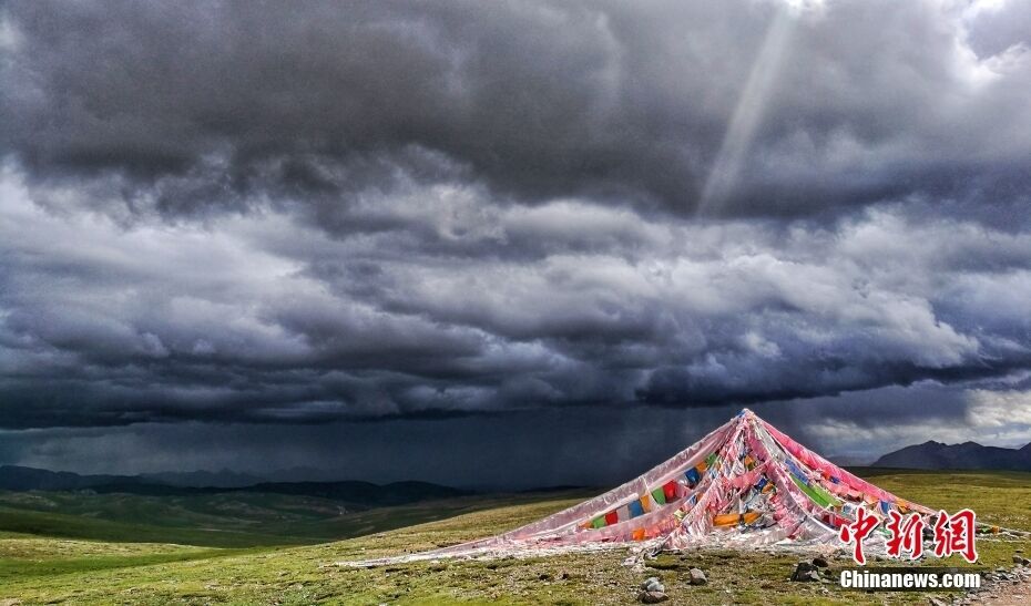杂多县地处澜沧江源头,被誉为“中国雪豹之乡”,其境内有高山、湖泊、草原等,风景独特。图为杂多草原乌云滚滚来袭,一束阳光照在经幡上。中新社记者 刘忠俊 摄