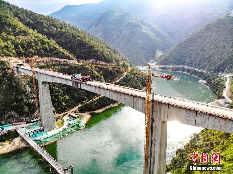 澜沧江双线大桥是高地震烈度区世界最大跨度铁路双线桥,大桥合龙标志着中国桥梁建设迈上新水平,也为国内外在高地震烈度区、复杂地质条件下建设同类桥梁提供宝贵经验。中新社发 王一翔 摄