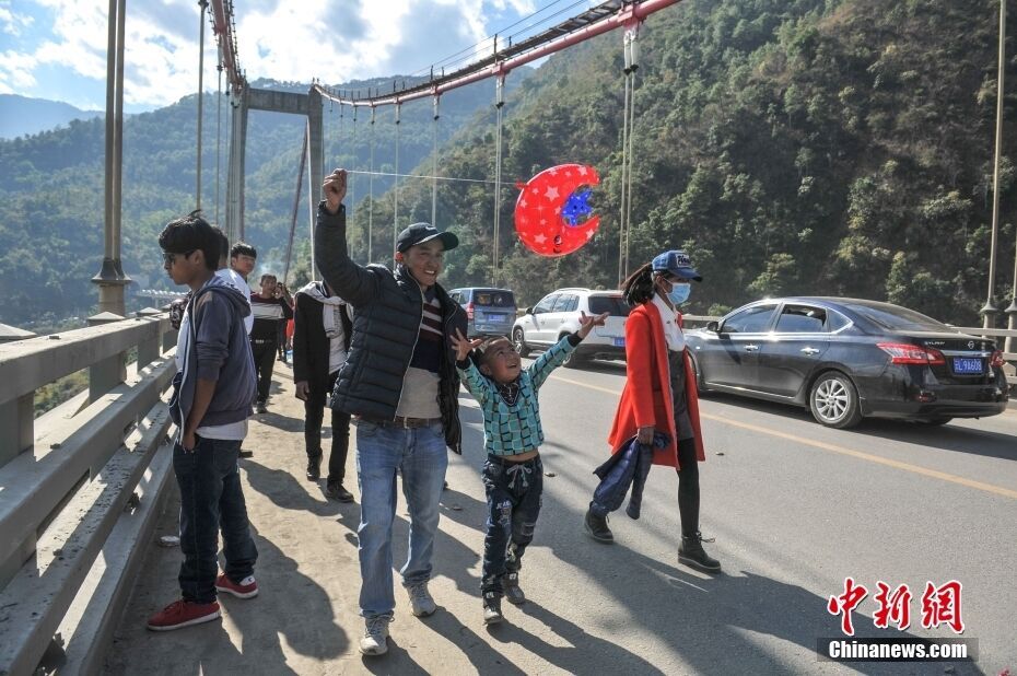 位于云南省临沧市云县境内的澜沧江大桥上,各地民众聚集到此,购物赶集。中新社记者 任东 摄
