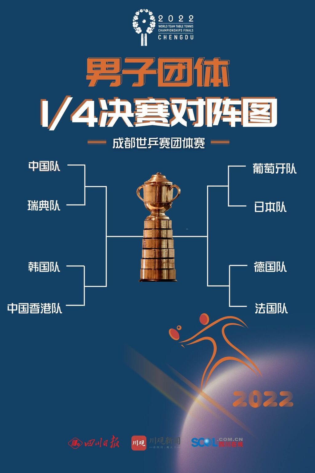 至此,本届成都世乒赛男子团体比赛的八强全部出炉。即将开始的淘汰赛对阵为:中国队VS瑞典队、葡萄牙队VS日本队、韩国队VS中国香港队、德国队VS法国队。