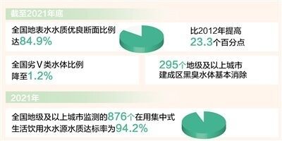 城市黑臭水体治理取得显著进展。“十三五”期间,地级及以上城市新建污水管网9.9万公里。用于黑臭水体整治的直接投资约1.5万亿元,在治理污染的同时有效拉动了地方投资和经济发展。到2021年底,全国劣Ⅴ类水体比例下降至1.2%;295个地级及以上城市建成区黑臭水体基本消除,总体实现城市黑臭水体治理攻坚战目标,提升了城市品质,改善了人居环境。