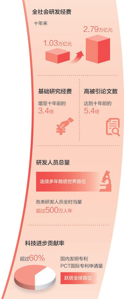 十年来,全社会研发经费从每年1.03万亿元增长到2.79万亿元,研发强度从1.91%提高到2.44%;基础研究经费增至十年前的3.4倍,高被引论文数达到十年前的5.4倍;研发人员总量连续多年稳居世界首位,每万名就业人员中研发人员数量持续提升;科技进步贡献率超过60%,国内发明专利、PCT国际专利申请量跃居全球首位……我国走出了一条从人才强、科技强,到产业强、经济强、国家强的发展道路。
