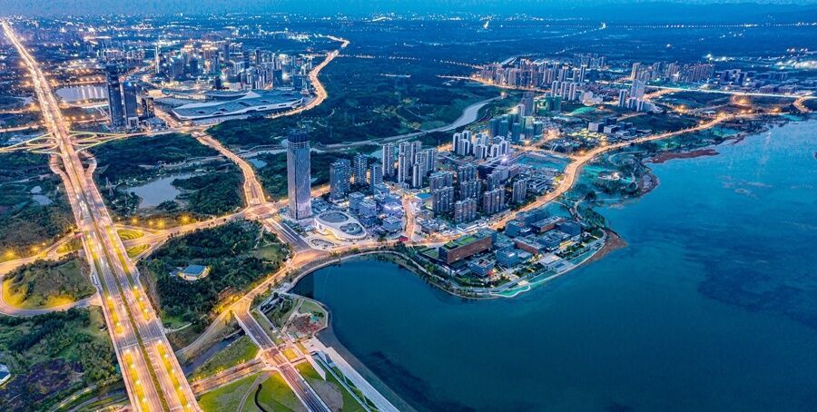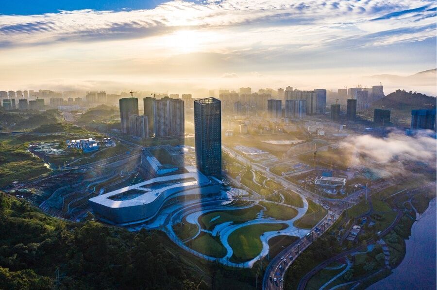 围绕“一极一源、两中心两地”的目标定位,提升成都极核发展能级,建强现代化成都都市圈,促进一轴两翼协同联动,加快推动成渝地区双城经济圈建设成势见效。图为四川天府新区成都市兴隆湖片区。
