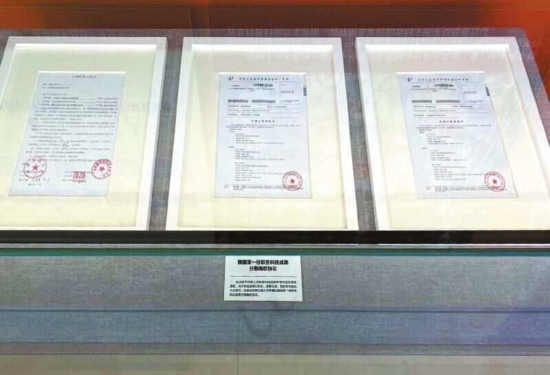 在四川展区中,有一份来自西南交通大学的职务科技成果分割确权协议,三张手续证书被精细装裱,一字排开,足足用了一个展柜。