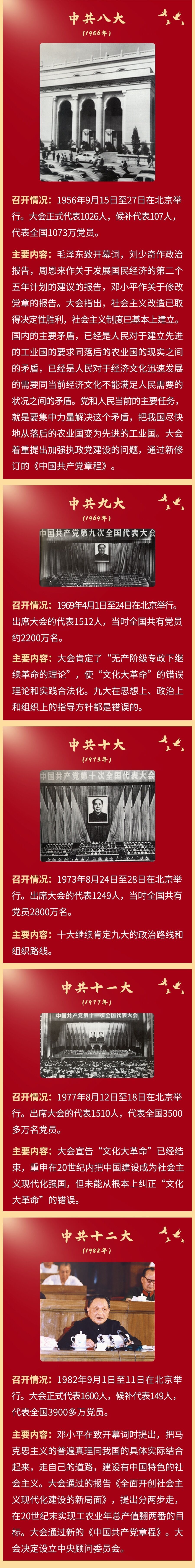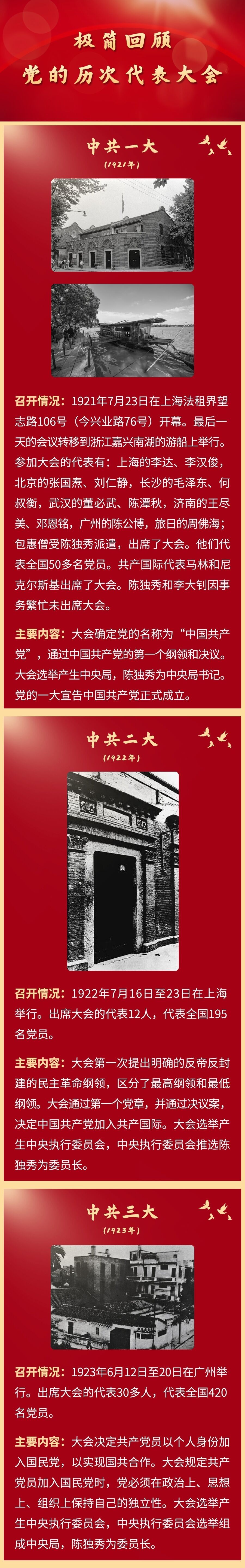 党的二十大即将隆重开幕。此次会议是在全党全国各族人民迈上全面建设社会主义现代化国家新征程、向第二个百年奋斗目标进军的关键时刻召开的一次十分重要的大会。党建网微平台依据《中国共产党一百年大事记》整理了党的一大至十九大“极简史”,邀您一起学习了解中国共产党历次全国代表大会概况。
