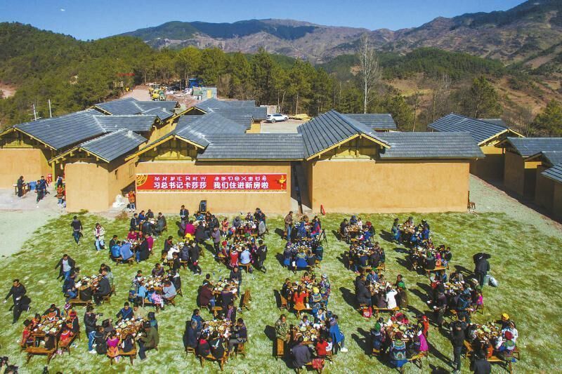 2019年2月11日,凉山州昭觉县三河村搬迁点,村民们喜气洋洋围坐在一起吃坝坝宴。川观新闻记者 杨树/摄