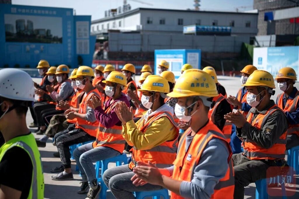 四川天府新区独角兽岛施工现场,建设者们集中收看党的二十大开幕会直播。(四川在线记者 杨树 摄)