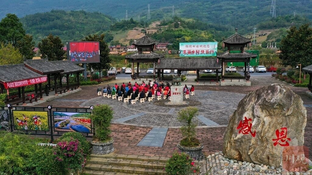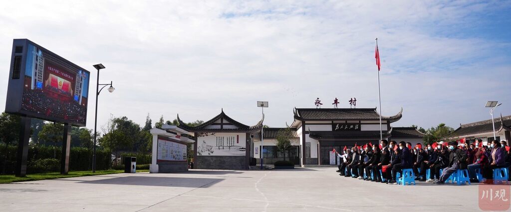 在眉山市洪雅县洪川镇祝山村村委会广场,县纪委、监委干部和村干部群众共同收看党的二十大开幕会直播。(川观拍客 姚永亮 摄)