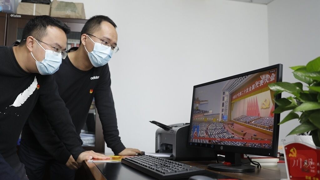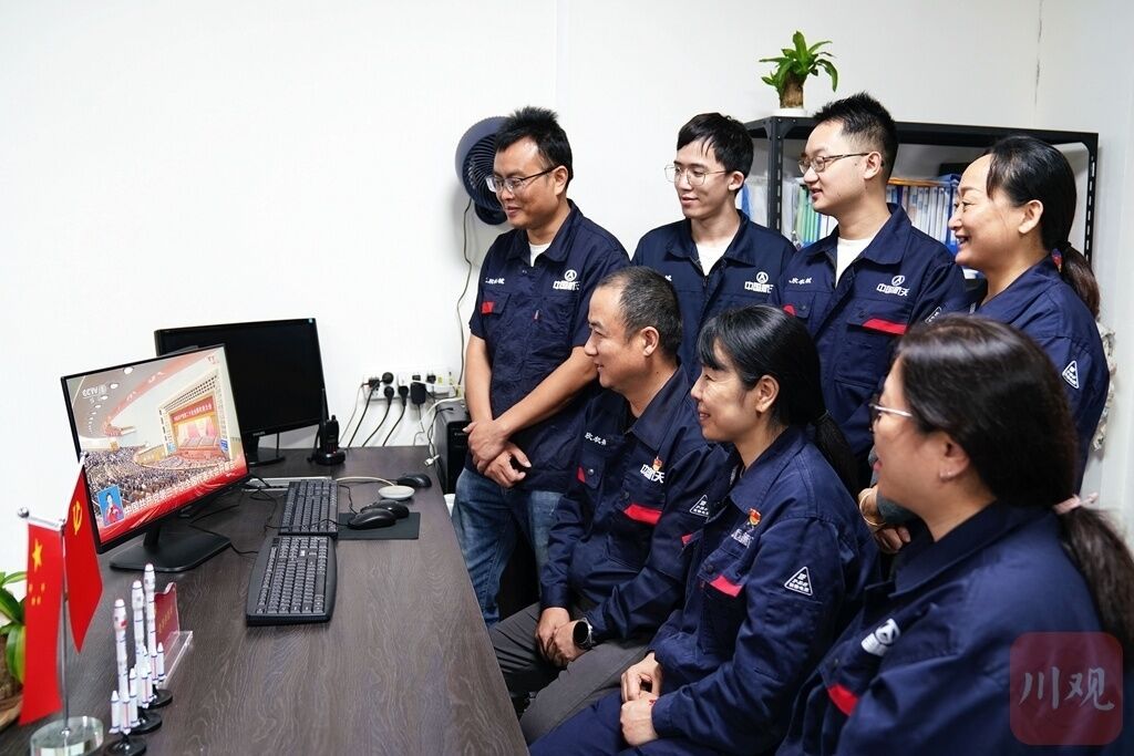 在泸州市龙马潭区的泸州市航天产业先进制造科技创新战略联盟内,联盟加盟企业工人聚在一起收看党的二十大开幕会直播。(川观拍客 杨尚威 摄)